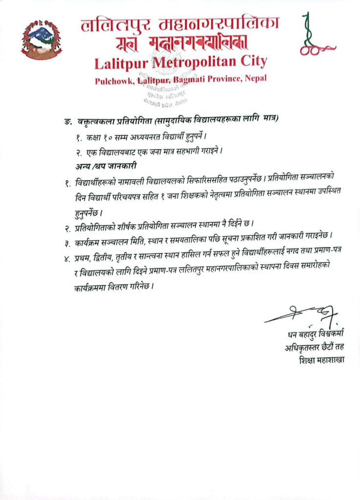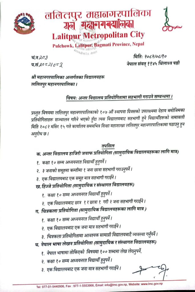 अन्तर विद्यालय प्रतियोगितामा सहभागी गराउने सम्बन्धमा।