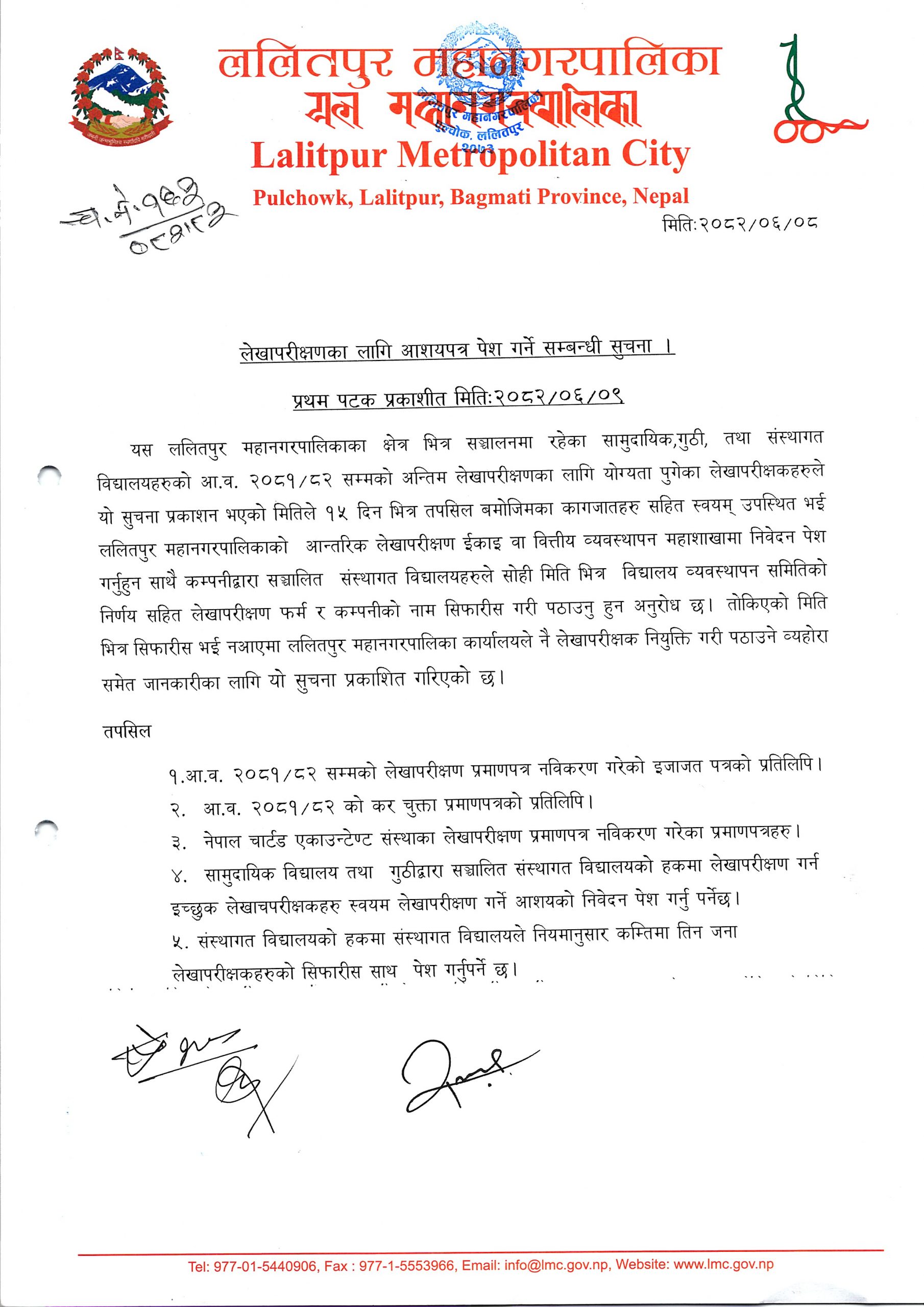 यस ललितपुर महानगरपालिकाका क्षेत्र भित्र सञ्चालनमा रहेका सामुदायिक, गुठी, तथा संस्थागत विद्यालयहरुको आ.व. २०८१/८२ सम्मको अन्तिम लेखापरीक्षणका लागि योग्यता पुगेका लेखापरीक्षकहरुले यो सुचना प्रकाशन भएको मितिले १५ दिन भित्र तपसिल बमोजिमका कागजातहरु सहित स्वयम् उपस्थित भई ललितपुर महानगरपालिकाको आन्तरिक लेखापरीक्षण ईकाइ वा वित्तीय व्यवस्थापन महाशाखामा निवेदन पेश गर्नुहुन साथै कम्पनीद्वारा सञ्चालित संस्थागत विद्यालयहरुले सोही मिति भित्र विद्यालय व्यवस्थापन समितिको निर्णय सहित लेखापरीक्षण फर्म र कम्पनीको नाम सिफारीस गरी पठाउनु हुन अनुरोध छ। तोकिएको मिति भित्र सिफारीस भई नआएमा ललितपुर महानगरपालिका कार्यालयले नै लेखापरीक्षक नियुक्ति गरी पठाउने व्यहोरा समेत जानकारीका लागि यो सुचना प्रकाशित गरिएको छ। तपसिल १.आ.व. २०८१/८२ सम्मको लेखापरीक्षण प्रमाणपत्र नविकरण गरेको इजाजत पत्रको प्रतिलिपि । २. आ.व. २०८१/८२ को कर चुक्ता प्रमाणपत्रको प्रतिलिपि । ३. नेपाल चार्टड एकाउन्टेण्ट संस्थाका लेखापरीक्षण प्रमाणपत्र नविकरण गरेका प्रमाणपत्रहरु। ४. सामुदायिक विद्यालय तथा गुठीद्वारा सञ्चालित संस्थागत विद्यालयको हकमा लेखापरीक्षण गर्न इच्छुक लेखाचपरीक्षकहरु स्वयम लेखापरीक्षण गर्ने आशयको निवेदन पेश गर्नु पर्नेछ । ५. संस्थागत विद्यालयको हकमा संस्थागत विद्यालयले नियमानुसार कम्तिमा तिन जना लेखापरीक्षकहरुको सिफारीस साथ पेश गर्नुपर्ने छ।
